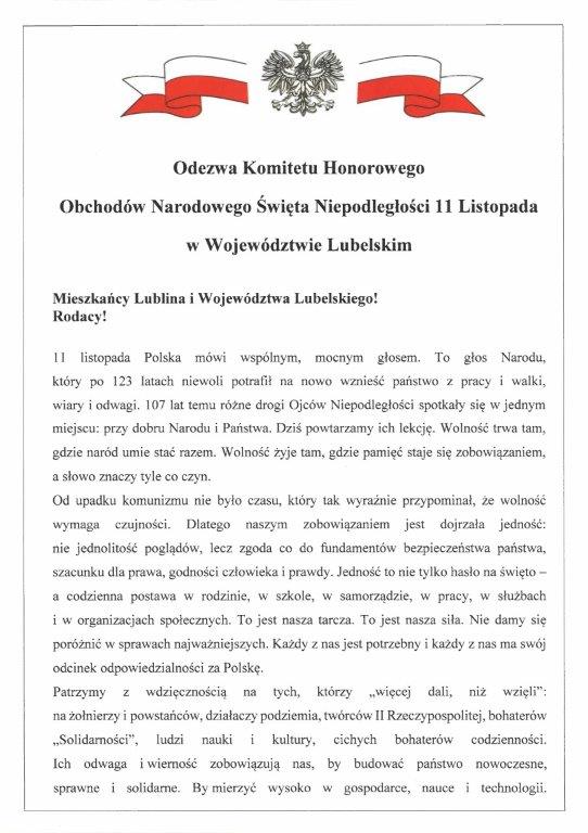 InformacjeKomunikaty Odezwa Komitetu Honorowego Obchodów Narodowego Święta Niepodległości 11 listopada w Województwie Lubelskim Gmina 4 dni
