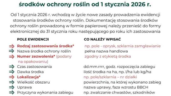 Zgodnie z komunikatem Wojewódzkiego Inspektoratu Ochrony Roślin i Nasiennictwa w Lublinie od 1 stycznia 2026 r. obowiązują nowe zasady prowadzenia ewidencji stosowanych środków ochrony roślin. Prosimy rolników i użytkowników profesjonalnych środków ochrony roślin o zapoznanie się z przekazanym komunikatem oraz wzorem nowej ewidencji. – Wzór dokumentacji dotyczącej stosowanych środków ochrony roślin – obowiązuje od 01.01.2026 r. …